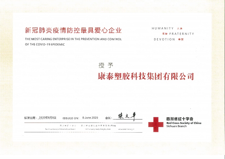 2020.11康泰集團(tuán)榮獲四川省“新冠肺炎疫情防控最具愛(ài)心企業(yè)”稱號(hào)近日,為表彰康泰塑膠科技集團(tuán)在新冠疫情防控工作中的突出貢獻(xiàn),四川省紅十字會(huì)授予集團(tuán)“新冠肺炎疫情防控最具愛(ài)心企業(yè)”榮譽(yù)稱號(hào)。2020年1月,正當(dāng)全國(guó)人民喜迎新春佳節(jié)時(shí),一場(chǎng)突如其來(lái)的新型冠狀病毒肺炎疫情肆虐中華大地。面對(duì)新型冠狀病...閱讀人數(shù):7647 -