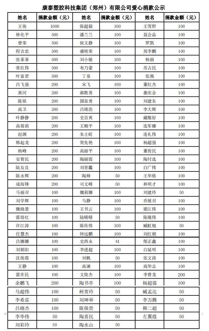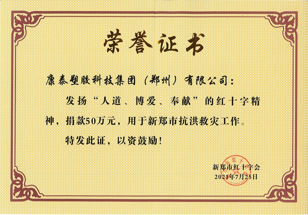康泰塑膠科技集團(tuán)(鄭州)有限公司,作為康泰集團(tuán)全資子公司,自2005年成立以來,16年來,公司始終堅持“扎根新鄭、服務(wù)華中”的經(jīng)營理念,在社會各界的關(guān)心關(guān)愛下,企業(yè)各項經(jīng)營事業(yè)均取得了長足的發(fā)展和進(jìn)步。在此,感謝鄭州市委市政府、新鄭市委市政府,以及全體新鄭人民的支持和關(guān)心。雖然,鄭州子公司也在此次洪災(zāi)中遭受了不同程度的損失,但是,鄭州子公司對新鄭人民的受災(zāi)感同身受,在自身受原材料價格暴漲,企業(yè)經(jīng)營面臨挑戰(zhàn)的情況下,依然積極履行社會責(zé)任,為河南抗洪救災(zāi)略盡綿薄之力。公司全體員工也自發(fā)捐款,點點愛心,匯聚成河,無私助人,溫暖真情。共同祝愿河南人民早日恢復(fù)正常生產(chǎn)生活,文化河南,壯美中原。
