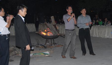 晚宴后,大家紛紛來到戶外,圍著篝火舉杯歡唱,在主持人幽默詼諧的帶領(lǐng)下,參與互動(dòng)的員工熱情高昂?;顒?dòng)一直持續(xù)到晚上10點(diǎn),大家仍然意猶未盡。