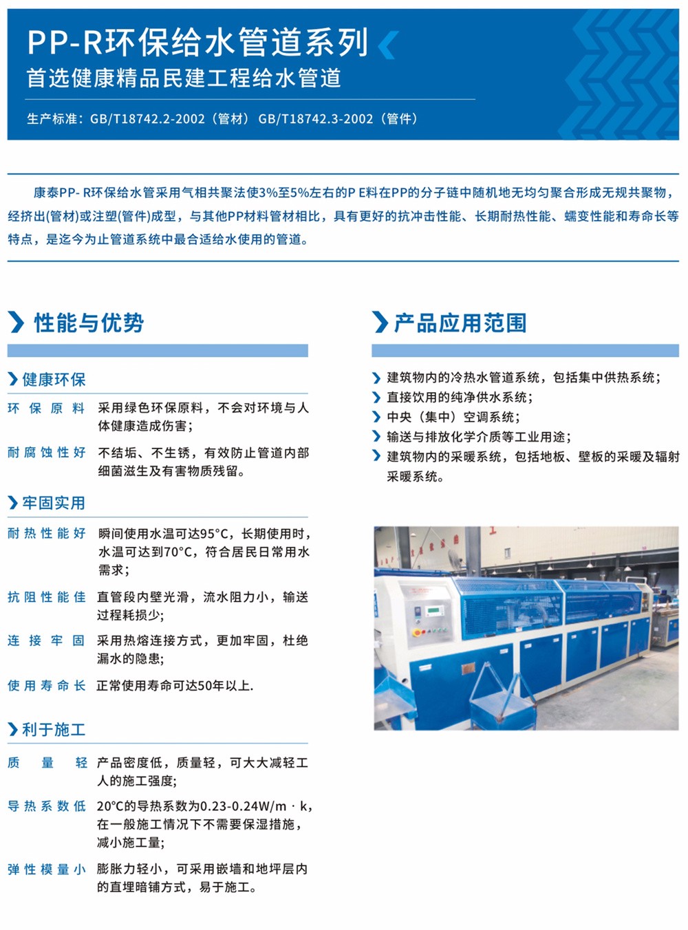 歐洲90年代初開(kāi)發(fā)應(yīng)用的新型塑料管道產(chǎn)品。該產(chǎn)品采用氣相共聚法使3%至5%左右的PE料在PP的分子鏈中隨機(jī)地?zé)o均勻聚合形成無(wú)無(wú)規(guī)共聚物,經(jīng)擠出(管材)或注塑(管件)成型。PP-R較其它PP材料具有更好的抗沖擊性能,又具備長(zhǎng)期耐熱性和蠕變性能,在相同溫度和內(nèi)壓條件下使用壽命更長(zhǎng)。PP-R管道在輸送70℃以下的熱水,長(zhǎng)期內(nèi)壓為1MPa條件下使用壽命為50年,是迄今為止管道系統(tǒng)中最合適給水使用的管道。