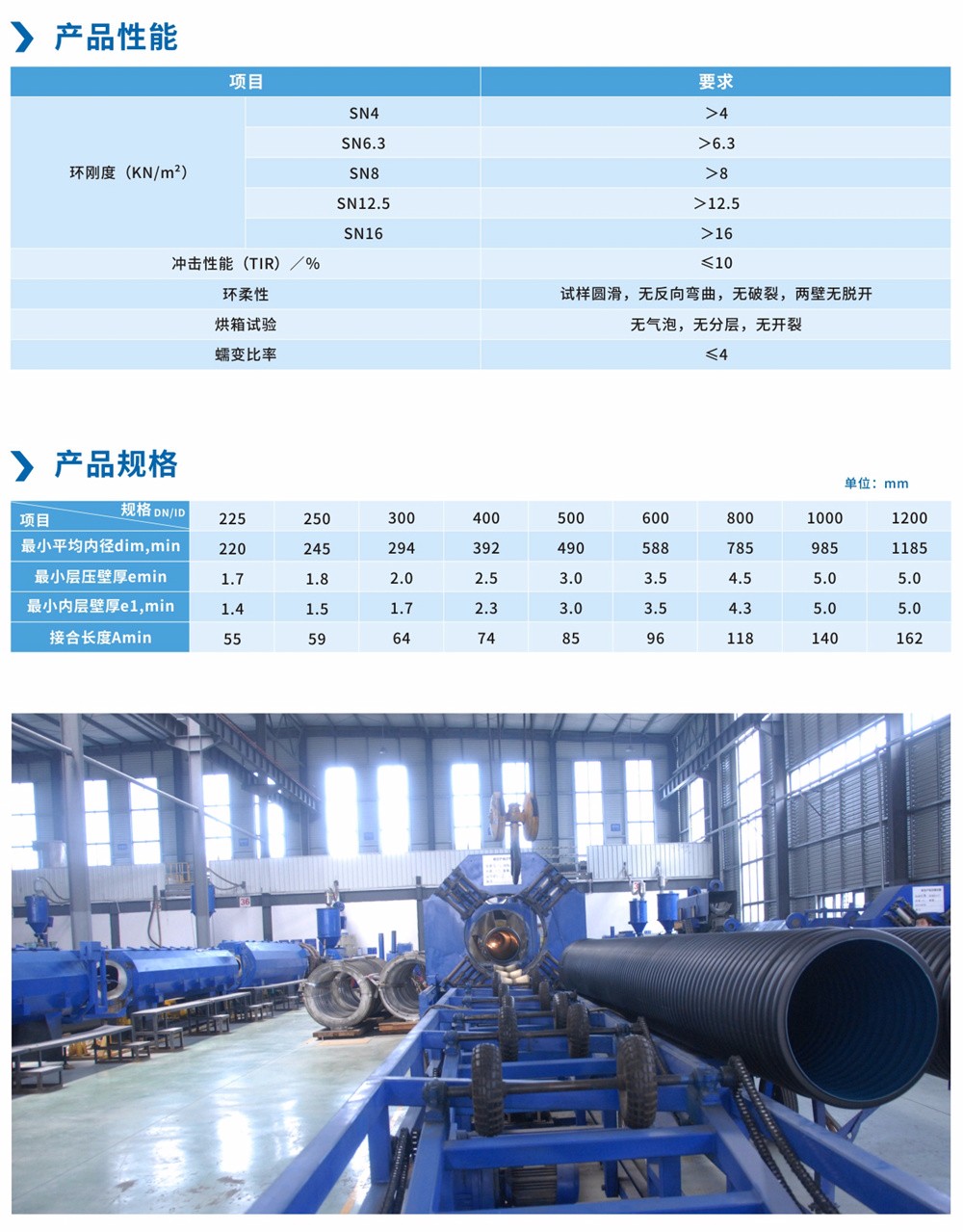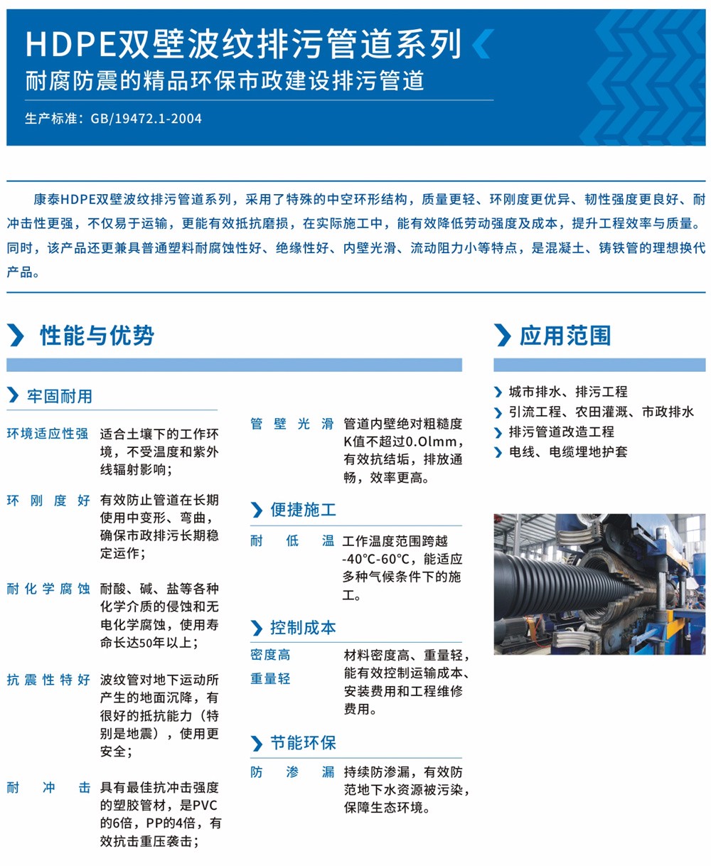 HDPE雙壁波紋管有普通塑料管所具有的耐腐蝕性好、絕緣性好、內(nèi)壁光滑、流動(dòng)阻力小等特點(diǎn)以外,還因采用了特殊的中空環(huán)形結(jié)構(gòu),具有優(yōu)異的環(huán)剛度和良好的強(qiáng)度與韌性,及重量輕、耐沖擊性強(qiáng)、不易破損等特點(diǎn),目前在發(fā)達(dá)國家的諸多領(lǐng)域已經(jīng)廣泛應(yīng)用,尤其是在美國、加拿大、日本以及歐洲許多國家,雙壁波紋管廣泛應(yīng)用于市政排水排污、農(nóng)業(yè)灌溉、煤礦通風(fēng)、化工,此外,對(duì)比混凝土、鑄鐵管,有運(yùn)輸安裝方便,降低施工人員勞動(dòng)強(qiáng)度及降低工程的總投資等優(yōu)勢(shì),是混凝土、鑄鐵管的理想換代產(chǎn)品。