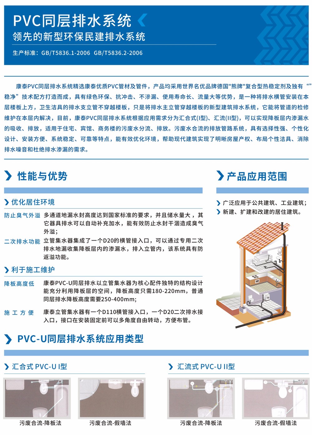 康泰PVC同層排水系統(tǒng)精選康泰優(yōu)質(zhì)PVC管材及管件,產(chǎn)品均采用世界名優(yōu)品牌德國(guó)“熊牌”復(fù)合型熱穩(wěn)定劑及獨(dú)有“穩(wěn)凈”技術(shù)配方打造而成 ,具有綠色環(huán)保、抗沖擊、不滲漏、使用壽命長(zhǎng)、流量大等優(yōu)勢(shì),是一種將排水橫管安裝在本層樓板上方,衛(wèi)生潔具的排水支立管不穿越樓板,只是將排水主立管穿越樓板的新型建筑排水系統(tǒng),它能將管道的檢修維護(hù)在本層內(nèi)解決。目前,康泰PVC同層排水系統(tǒng)根據(jù)應(yīng)用需求分為匯合式(I型)、匯流式(Ⅱ型),可以實(shí)現(xiàn)降板層內(nèi)滲漏水的吸收、排放,適用于住宅、賓館、商務(wù)樓的污廢水分流、排放,污廢水合流的排放管路系統(tǒng),具有選擇性強(qiáng)、個(gè)性化設(shè)計(jì)、安裝方便、系統(tǒng)穩(wěn)定、可靠等特點(diǎn),能有效優(yōu)化環(huán)境,幫助現(xiàn)代建筑實(shí)現(xiàn)了明晰房屋產(chǎn)權(quán)、布局個(gè)性潔具、消除排水噪音和杜絕排水滲漏的需求。